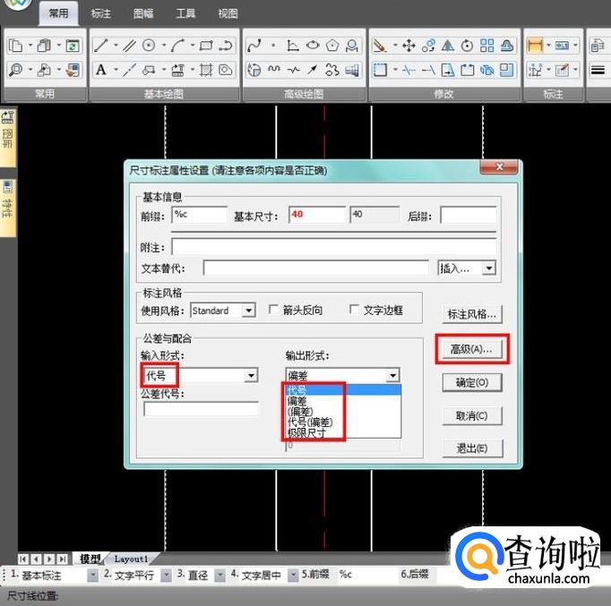 当然上一步的选项是满足不了需求的,可以右键单击,弹出“尺寸标注属性设置”框,公差就是在这里添加的;
