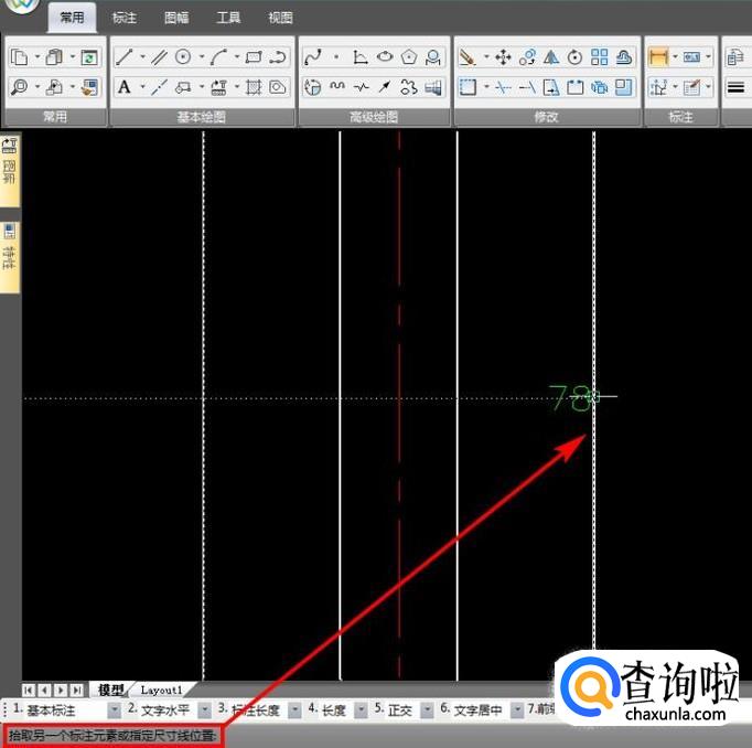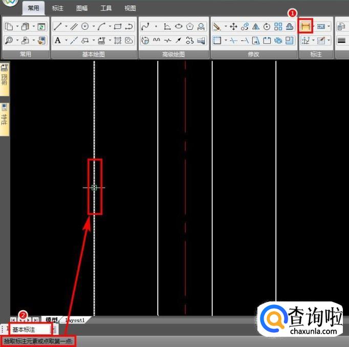 找到要标注的位置,使用尺寸标注里的基本标注,这里标注轴的尺寸,按照提示点击轴的一边;