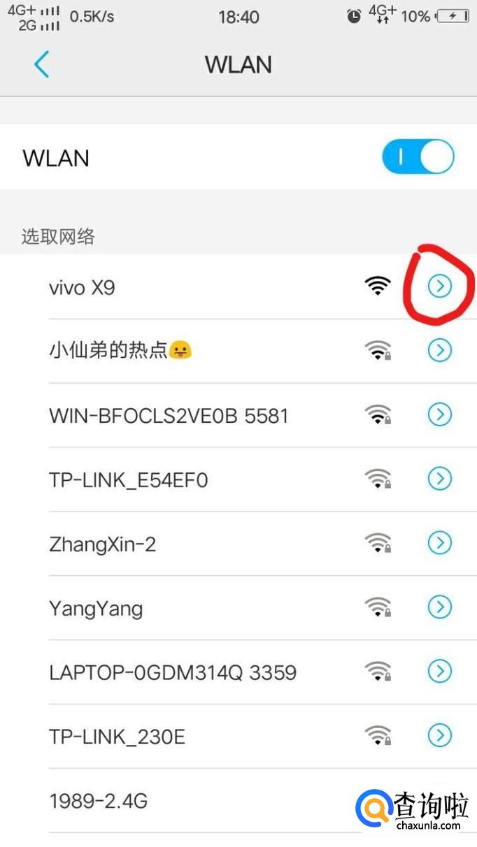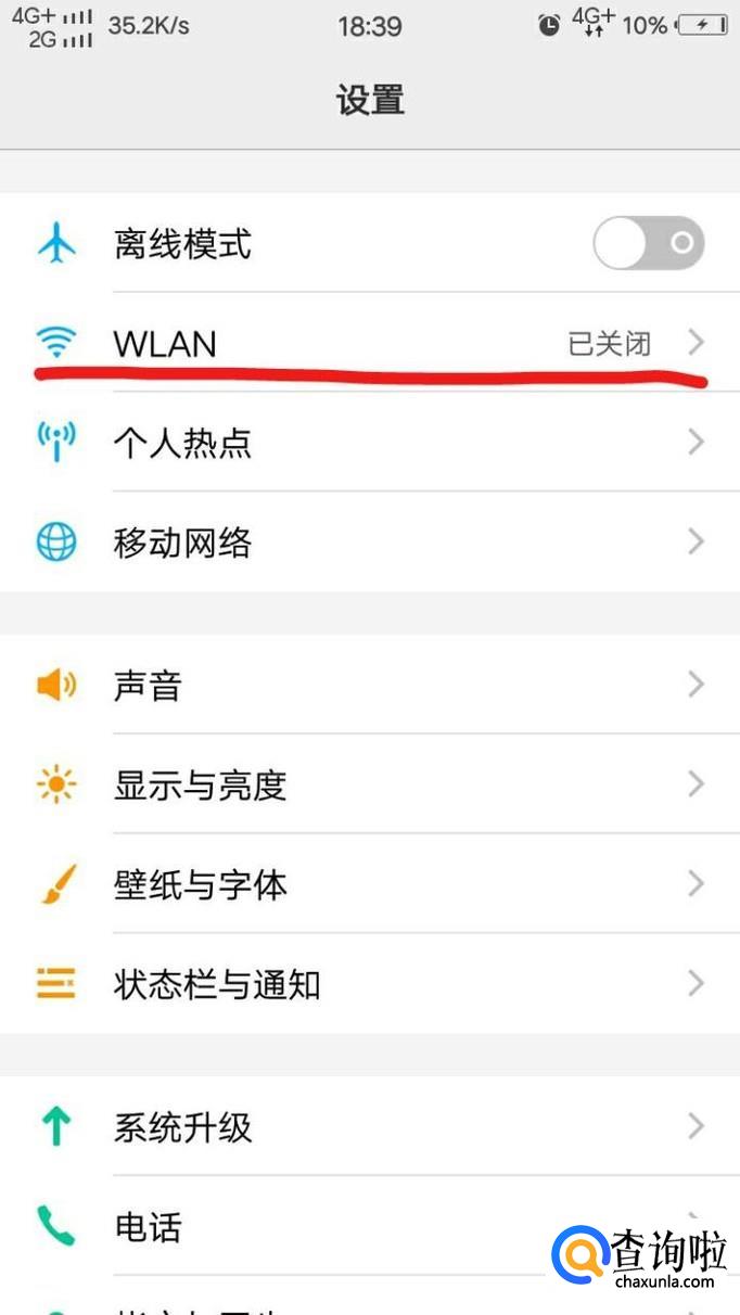 然后,点击“WLAN”,将其开启。然后随意点击一个热点后面的尖的符号