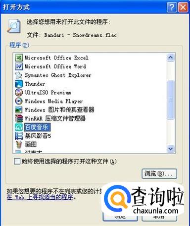 我们双击其中一个文件,现在不能直接打开了,但会弹出一个对话框,我们在中间的程序列表里找一找,看能否找到一个音乐播放器。如果有,就点一下它,再把下面的“始终使用选择的程序打开这种文件”前打钩,再点击下面的“确定”。