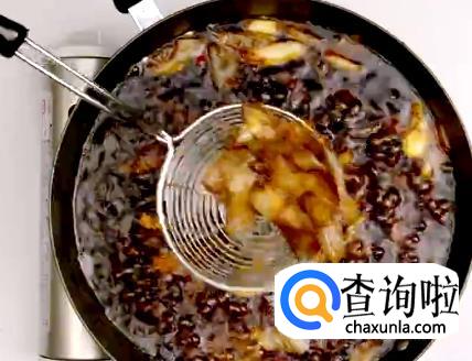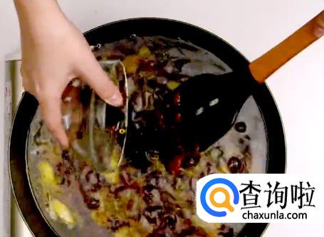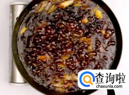 倒入豆豉,加一瓶白酒,不断混合底料,然后将煮透的葱段捞出。