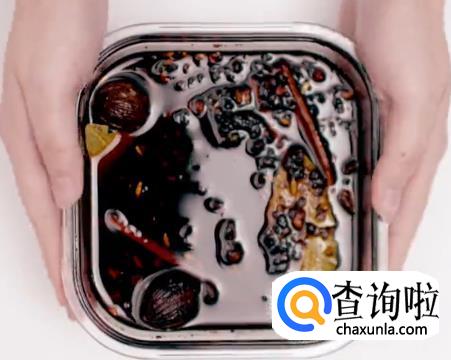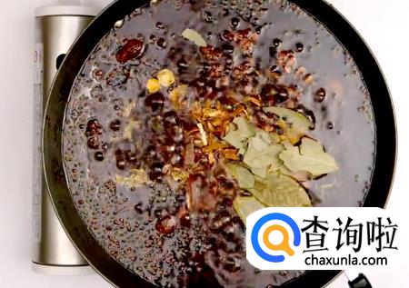 倒入青花椒,红花椒,然后下八角,丁香,三萘,陈皮,草果,茴香,甘草,桂皮等香料,在油锅中不断翻炒。