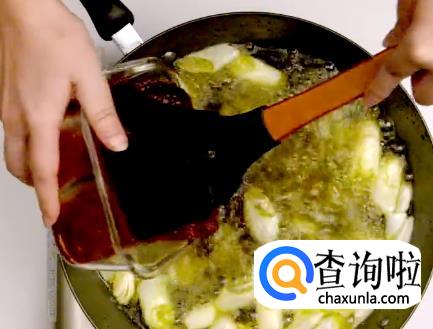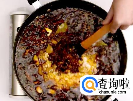 将葱段,大蒜,辣椒酱,豆瓣酱倒入油锅煎熬,用锅铲搅拌。