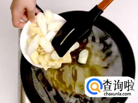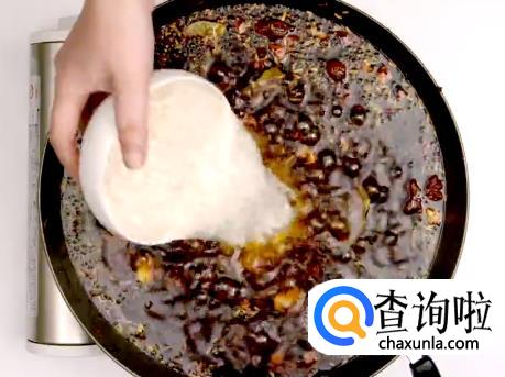 倒入大块冰糖和酒酿,不断翻炒直至冰糖融化。