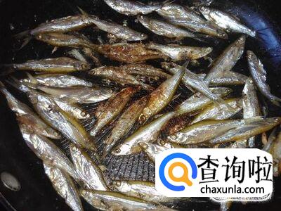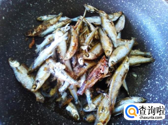 开火下油,把小刀子鱼均匀地撒在锅里用小火烘。