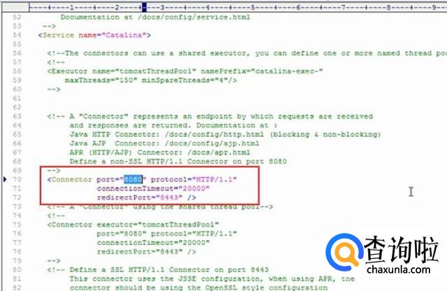 打开server.xml文件,找到如下图所示的代码,修改port的值即可