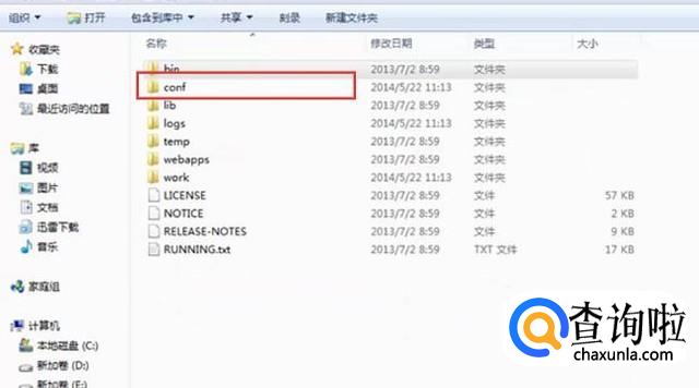 首先找到tomcat的安装目录,然后我们点击conf文件夹,如下图所示