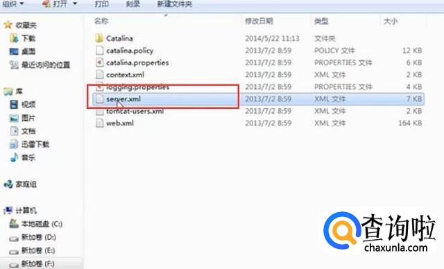 接下来进入conf文件夹,找到server.xml文件,端口的配置信息就在这个文件里,如下图所示