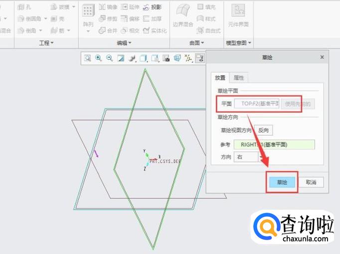 进入之后,点击草绘命按钮,进入草绘,选择Top平面作为草绘平面,如图所示。