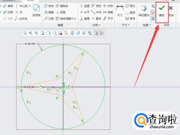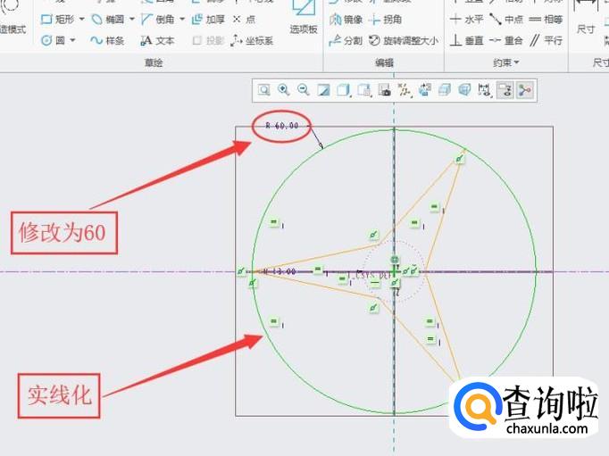 将外面虚线圆实线化,将其半径修改为60,修改结果如图所示,然后点击“确定”按键。