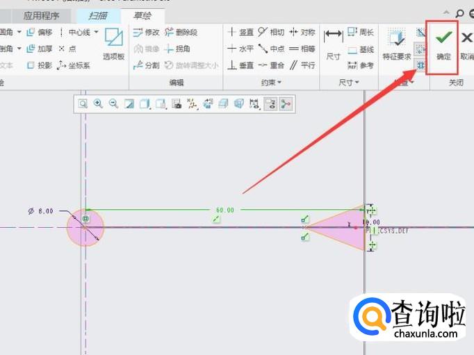 在第一个端点绘制一个直径为8的圆,在第二个端点绘制一个对称的三角形,具体数据如图所示,最后点击“确定”即可。