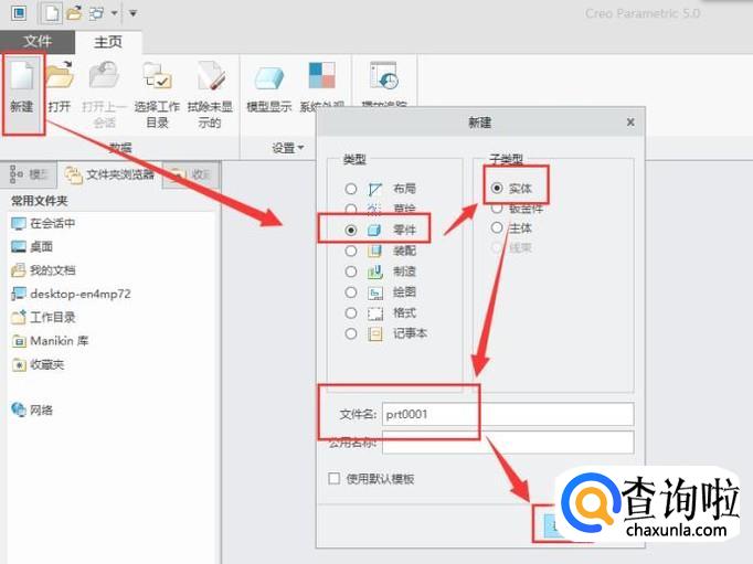打开creo软件,创建一个新的零件图,如图所示。
