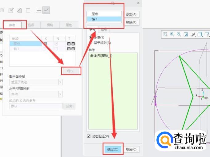 进入之后,点击“参考”,然后选择“更多”,将外面的圆设置为原始轨迹,里面的三角星形为辅助轨迹,如图所示。