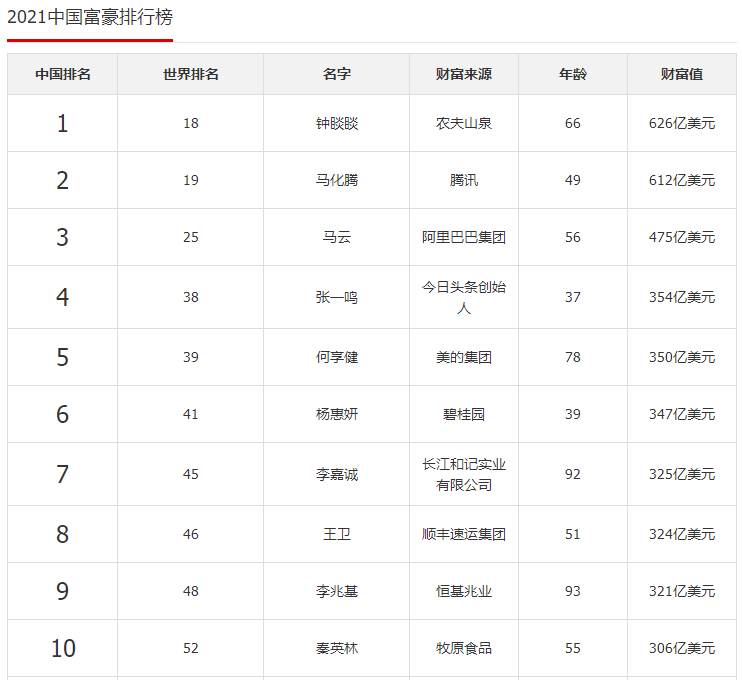 1、钟睒睒2、马化腾3、马云4、张—鸣5、何享健6、杨惠妍7、李嘉诚8、王卫9、李兆基10、秦英林。2021年的富豪榜,排名第一的是农夫山泉的创立者钟睒睒。今年64岁的他,财富值达到了626亿美元,在登顶中国首富的同时,在世界排名也达到了最高的18位。钟睒睒的农夫山泉,是国内唯一可以和宗庆后的娃哈哈相媲美的饮品企业。目前,这两家公司的产品可以说是占据了国内饮料市场的半壁江山!