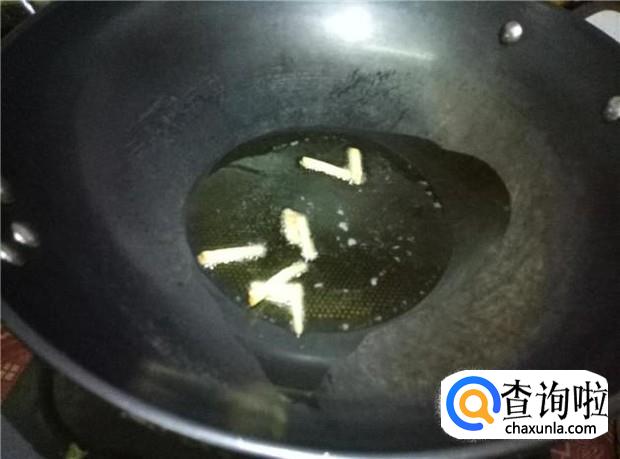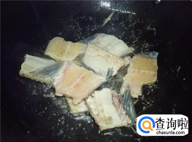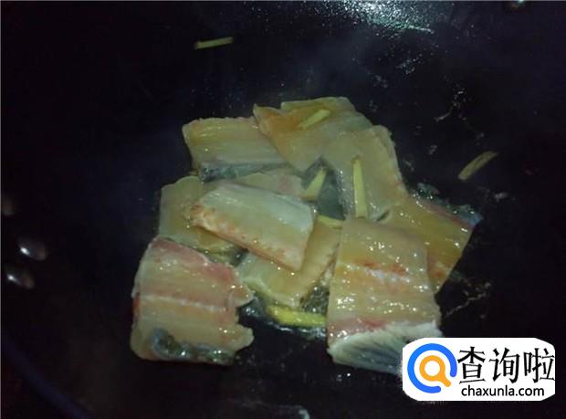 热锅下油,放入姜片煸香,再倒入腌制好的鱼骨。