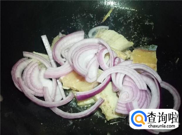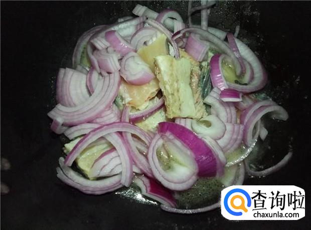 小火,慢慢煎一下鱼骨,把鱼骨煎到两面金黄,再倒入洋葱。