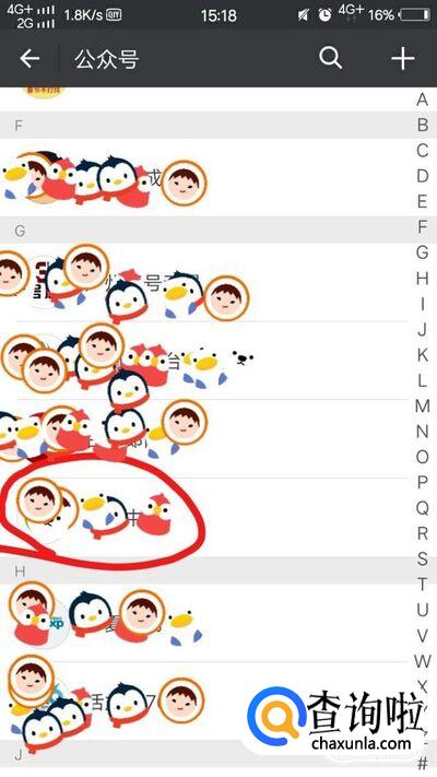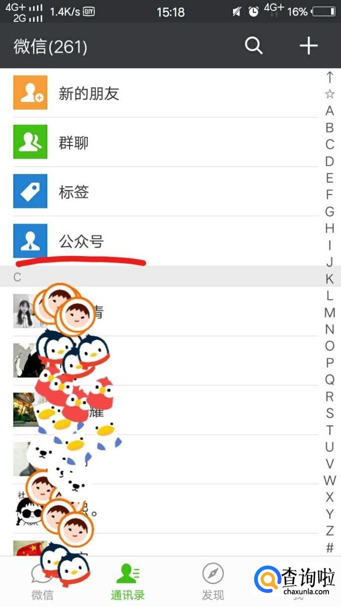 然后,在通讯录页面点击“公众号”,这样更容易找到自己想要转载文章的那个公众号。