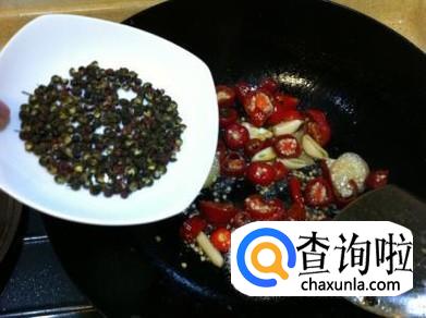 往炒锅中放入适量的干辣椒、花椒,小火将其炒香。然后,将辣椒、花椒放入容器中将其捣碎。