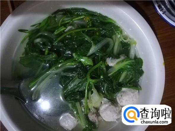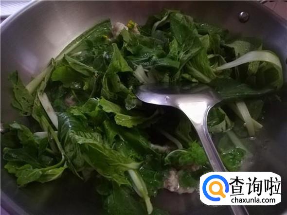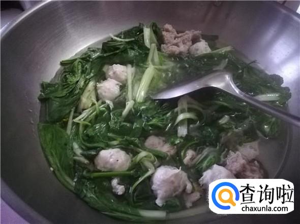 肉丸煮了大概三分钟,已经快熟了就倒入青菜。
