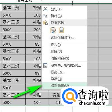 鼠标再右击表格,弹出菜单,再点“取消隐藏”即可。如果隐藏是列,操作方法也是一样的。