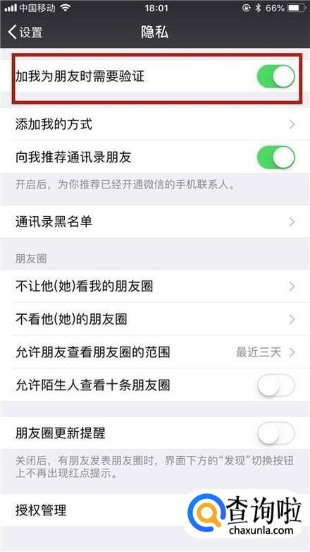 接着点击开机加我为朋友时需要验证开关,如下图所示。