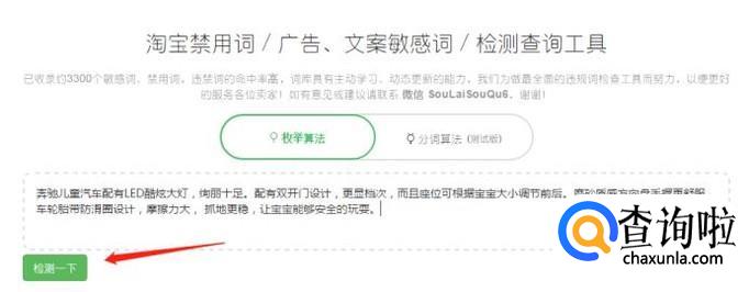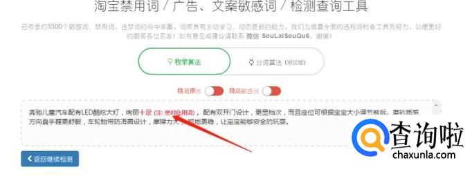 然后将商品信息粘帖在检测框内,然后点击“检测一下”,检测出现不符合的词汇会有相关的提示,我们将其修改即可。