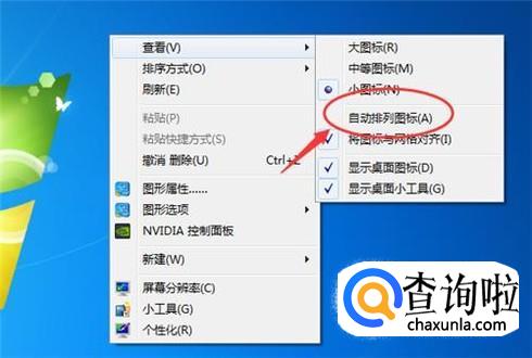 遇到上述情况不用着急,直接按步骤一到如图所示的设置框,选择“自动排列图标”就好了。