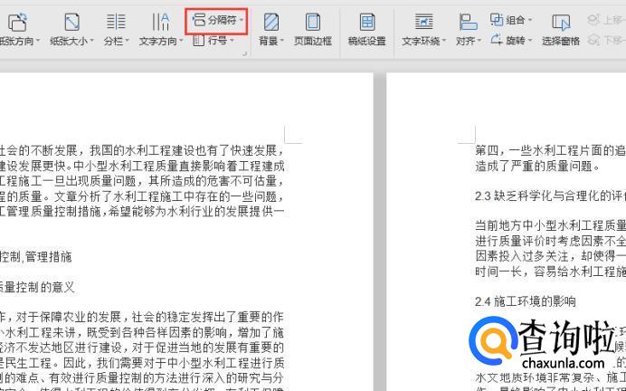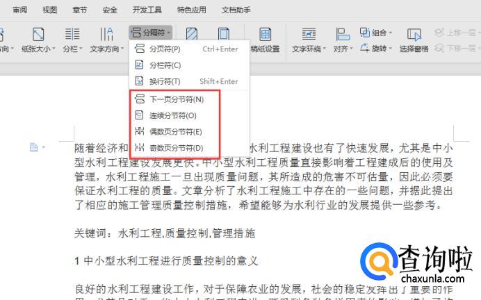 这里以【下一页分节符】为例,点击之后,就可以看到文字被分成了两页;