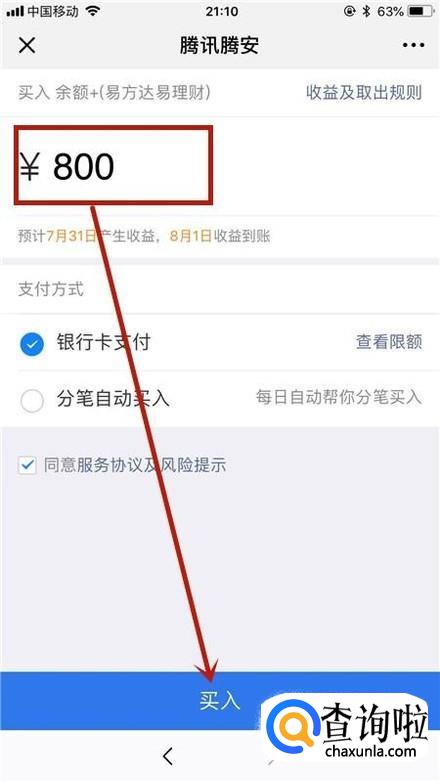 然后输入你要购买的金额并点击买入,如下图所示。