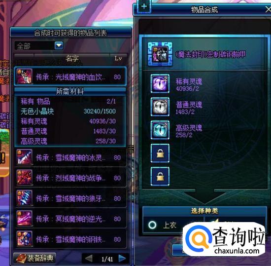 在赛利亚房间,点击赛利亚就可以看到,传承用紫装合成,圣物用粉装(按装备颜色分),粉装,传说合成需要上级元素结晶,灵魂数量可从背包“材料-灵魂仓库”里查询,灵魂账号绑定,分解机等级影响无色数量但不影响灵魂数量