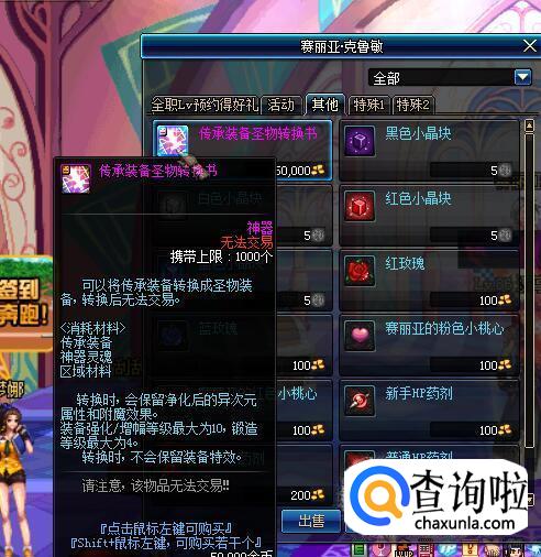 懒得做的可以拍卖直接买圣物或者传承,传承可用赛利亚商店出售的转换书进行转换(转换之后无法交易)