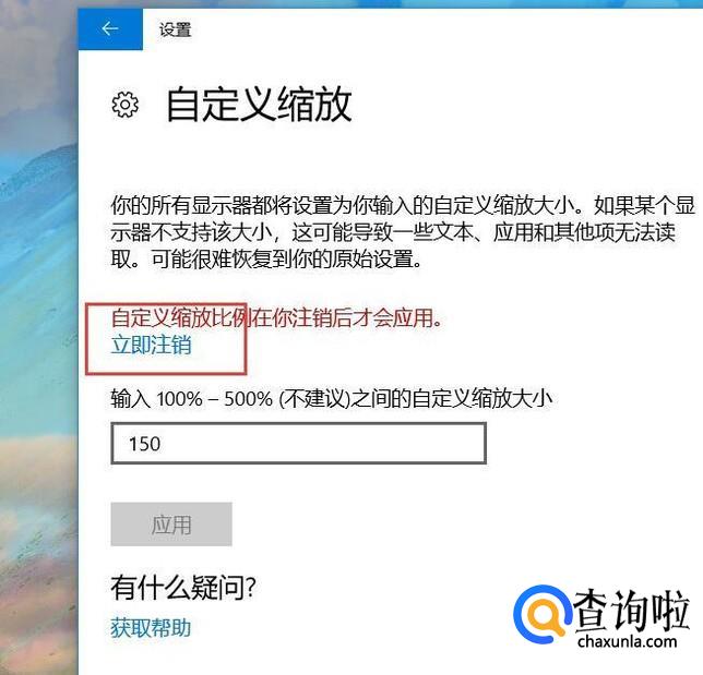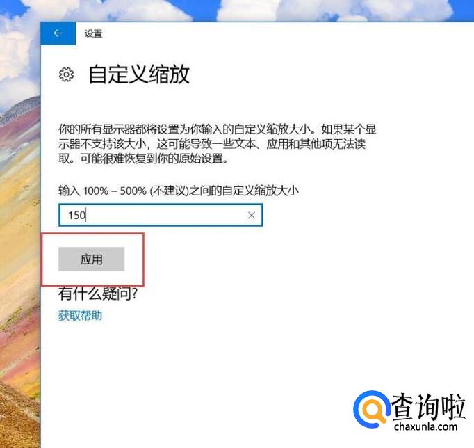 接下来,我们输入自定义缩放数值,可以输入150,然后点击“应用”按钮。