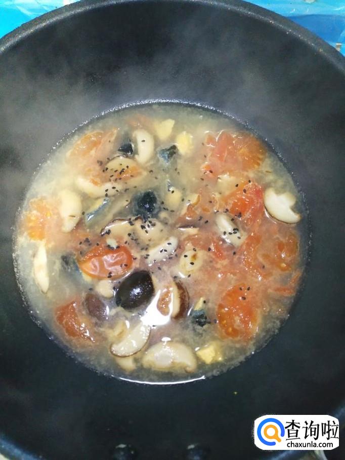 松花蛋适量,香菇适量,西红柿适量,盐适量,鸡精适量,大蒜适量,黑芝麻适量。