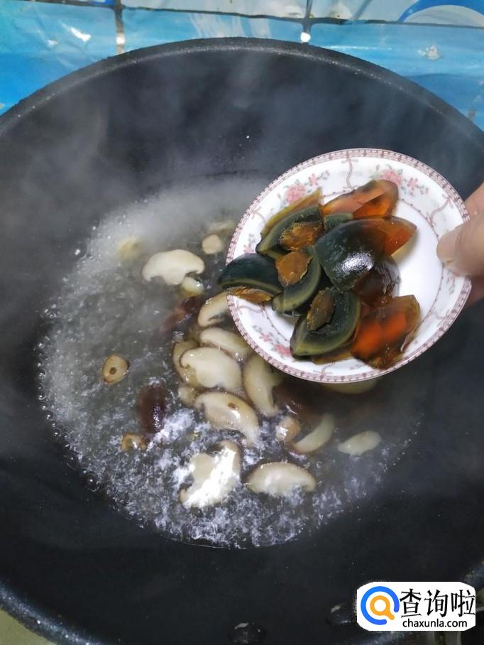 加入适量清水,大火将水烧开,然后将准备好的松花蛋倒入锅中煮一下。
