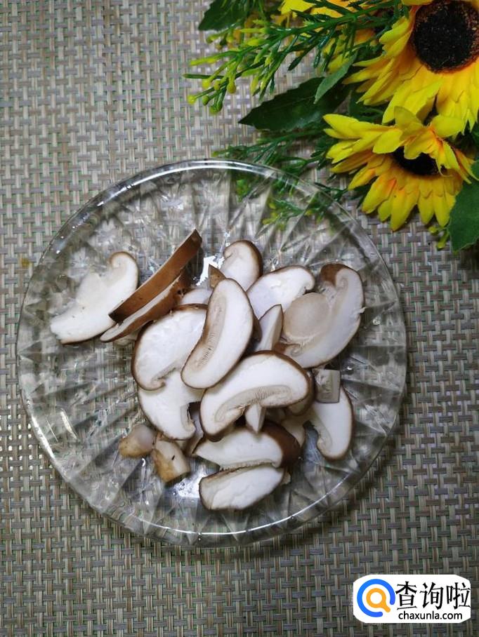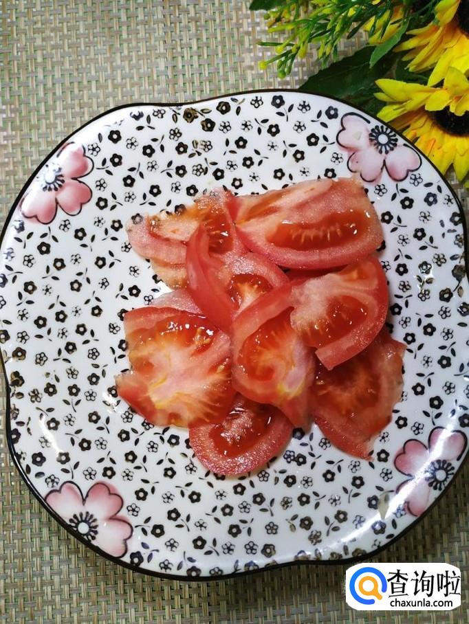 准备适量新鲜的香菇,洗净后,切成片,放入盘中备用,再准备适量西红柿,洗净后,切片备用。