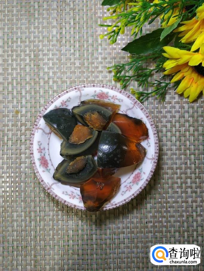锅中烧开水,然后将松花蛋放入锅中,煮五分钟左右,捞出过凉水放凉,然后切成小块,放入盘中备用。