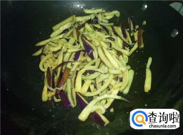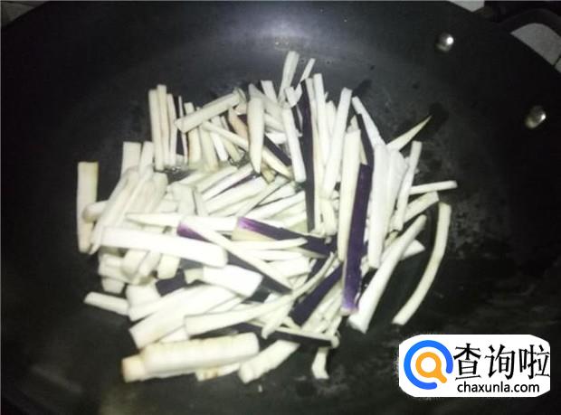 热锅下油,放入茄子丝翻炒,火不要开太大,要让所有的茄子丝都沾到油,油可以稍微放多一些。