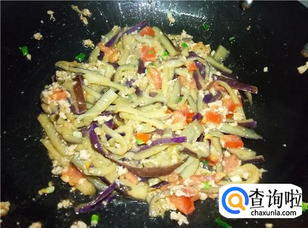 炒出番茄汁后,再加入炒软的茄子丝,再一起翻炒均匀,番茄会吸收一些茄子的油,这是整道菜的关键。