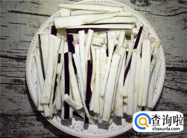茄子清洗干净,切掉头尾两端,然后先切段,再切丝。