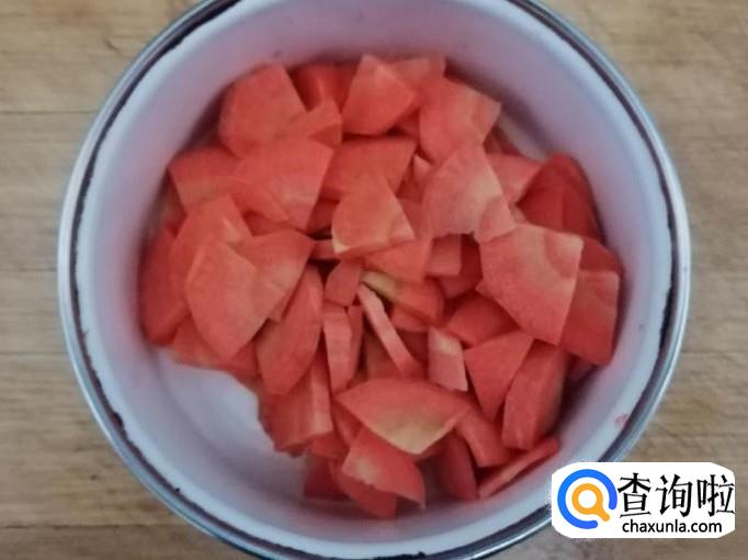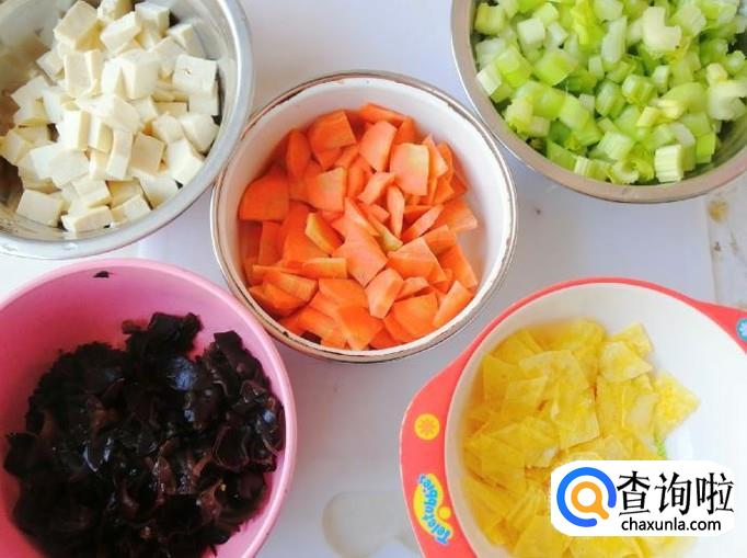 把一根胡萝卜,用清水洗净,切成胡萝卜丁待用,适量芹菜、木耳洗净切好待用,豆腐切成小块待用。