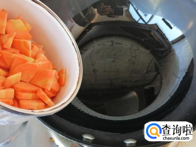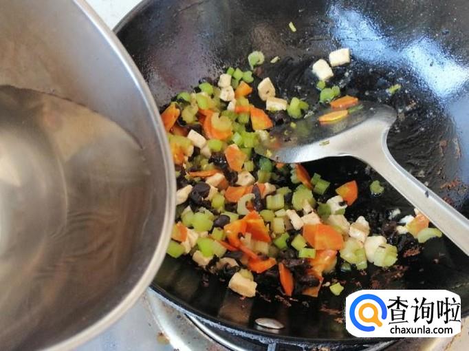 下面我们就准备炒菜调汤,炒锅放油,油热后依次放入备好的胡萝卜、芹菜、木耳、豆腐,用铲子翻炒均匀,加入适量盐,炒熟这些菜后,盛出来一些。