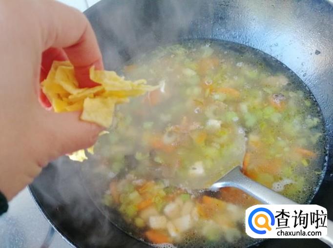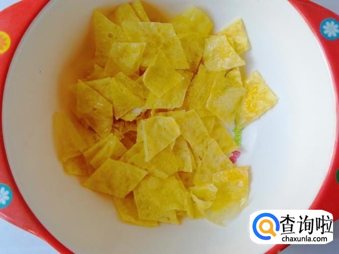 选用两个新鲜的鸡蛋,用清水洗净,磕入碗中,用筷子把鸡蛋打散,煎过刷油,把蛋液煎成鸡蛋饼,然后把鸡蛋饼切成菱形块待用。
