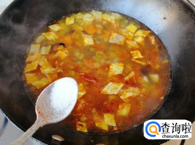 锅中留一半炒熟的菜,加入适量清水或热水,煮开后先加入适量臊子肉,煮开锅让肉和菜在锅中翻滚。