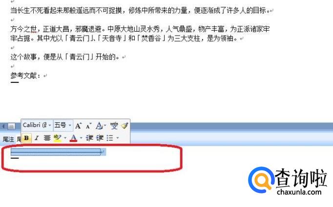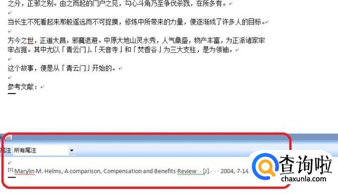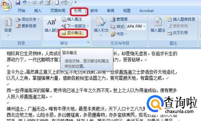 在标题栏点击“引用”,点击下方的“显示备注”按钮,文档底部出现如图所示变化。