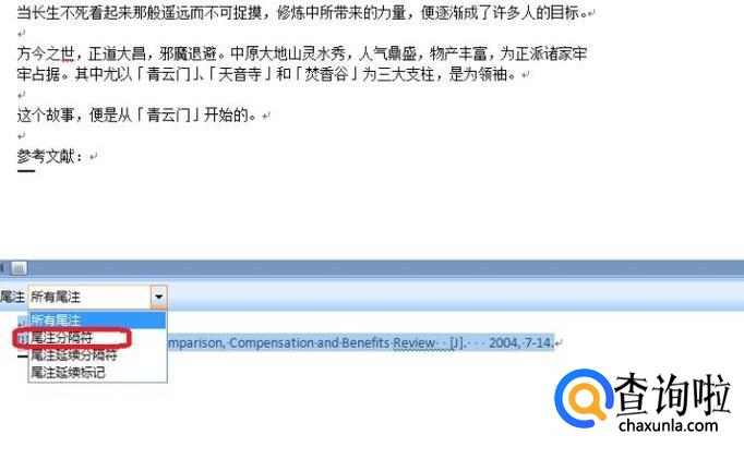 如图所示,鼠标把所有参考文献都选中,在“尾注”下拉菜单中选择“尾注分隔符”,点击一下。