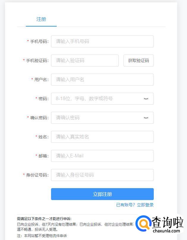 点击“立即注册”,按照系统提示注册完成后即可提交申诉。