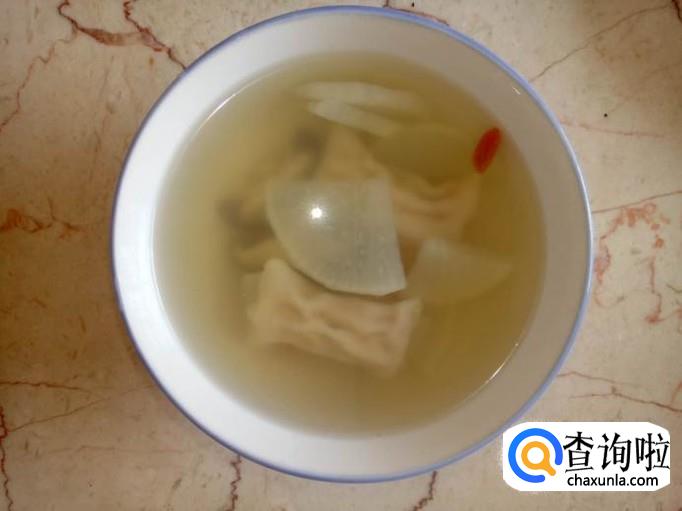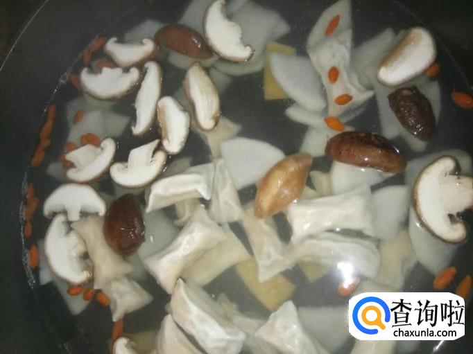 材料:白萝卜 鲜香菇 虾米饺 枸杞 姜 盐 鸡精
