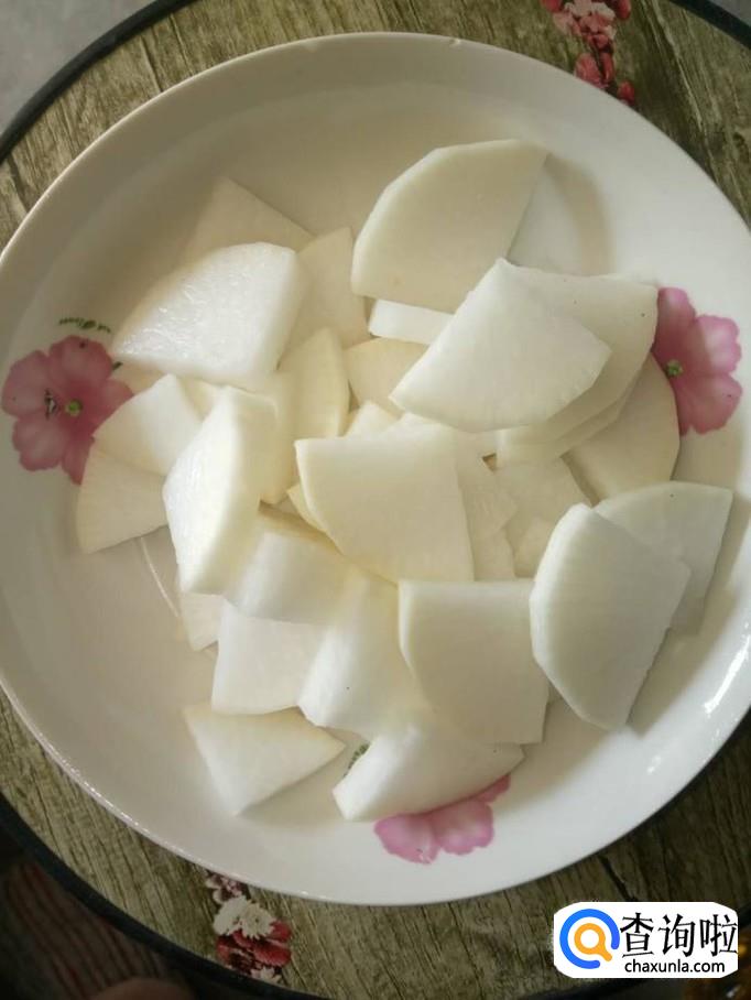 取半根白萝卜,将白萝卜削皮,清洗干净,切成薄片状;白萝卜买的时候要注意看是否新鲜,不新鲜的萝卜经常会有空心、无水分的情况,就不好吃了;