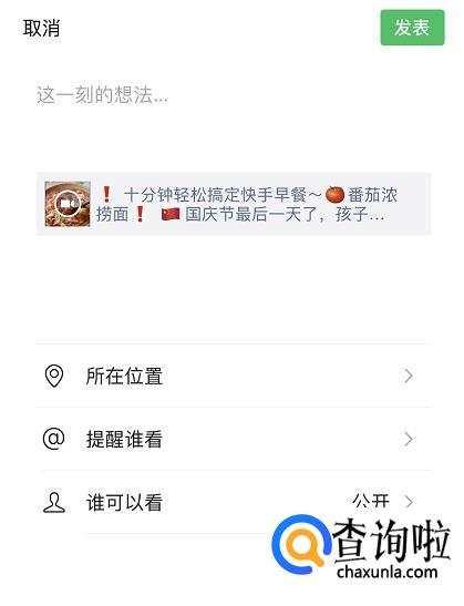 微信朋友圈的转发也是一样的道理,点击后会打开发布的界面,点击【发表】即可。