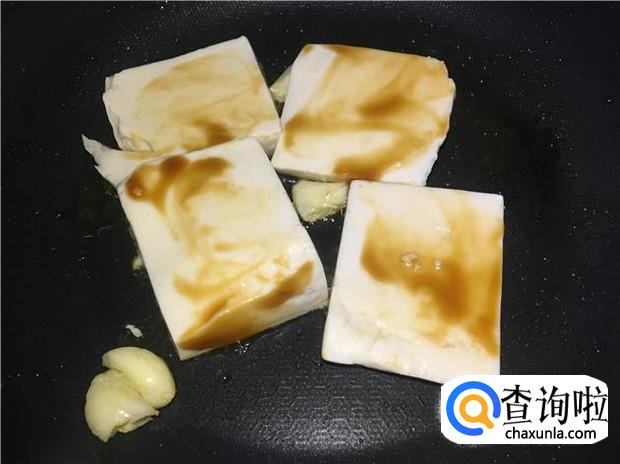 把豆腐一块块放入锅中,在表面刷上少许蚝油,洒少许盐,小火慢慢煎。